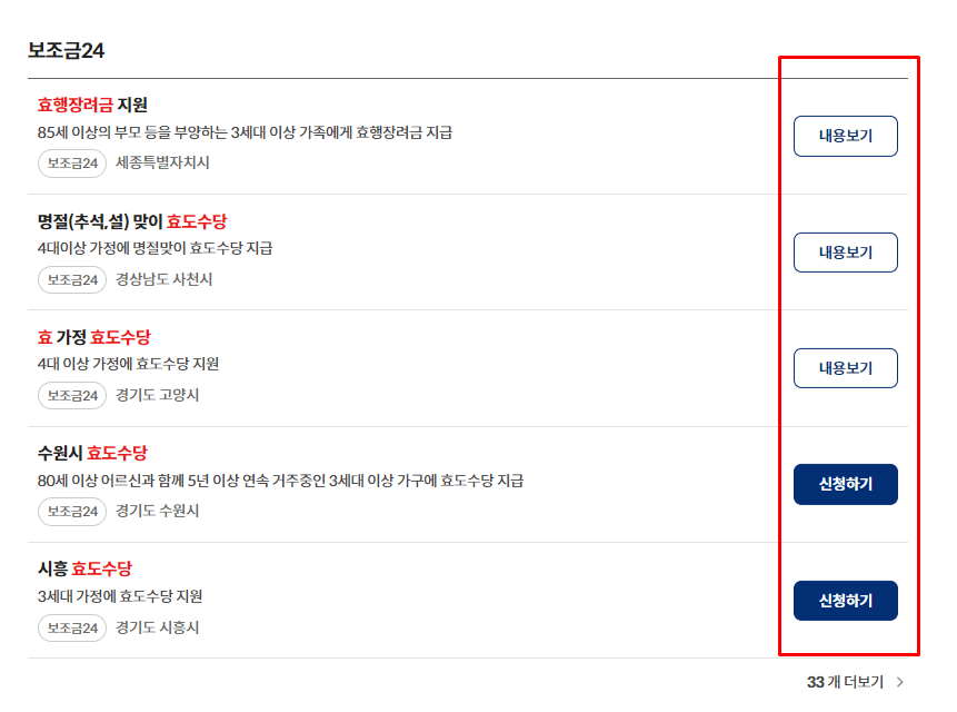 각 지자체별 내용을 확인하시고, 내용보기 또는 신청하기를 클릭