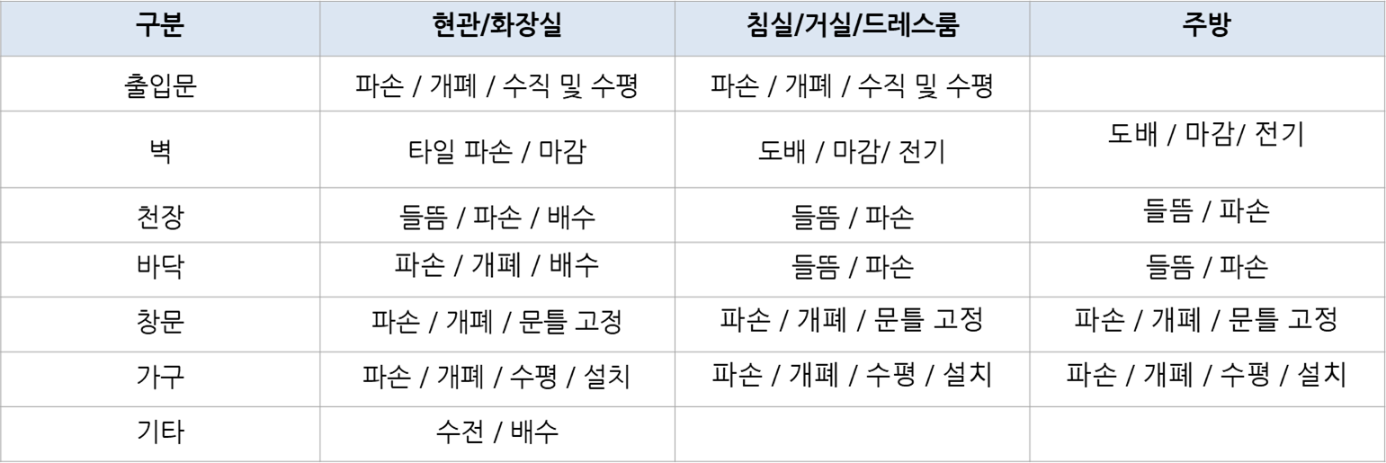 - 페인트 및 마감재: 벽이나 목재 작업의 마감 처리가 깔끔한지 확인합니다.
